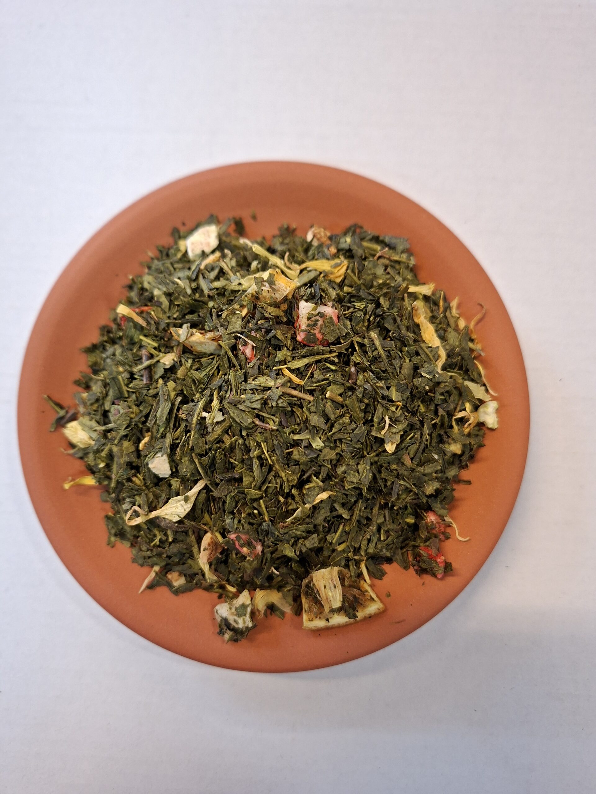 Zutaten: Grüner Tee, Zitronenschale, Orangenecken, Erdbeerstücke, natürliches Aroma, Ringelblumemblüten.